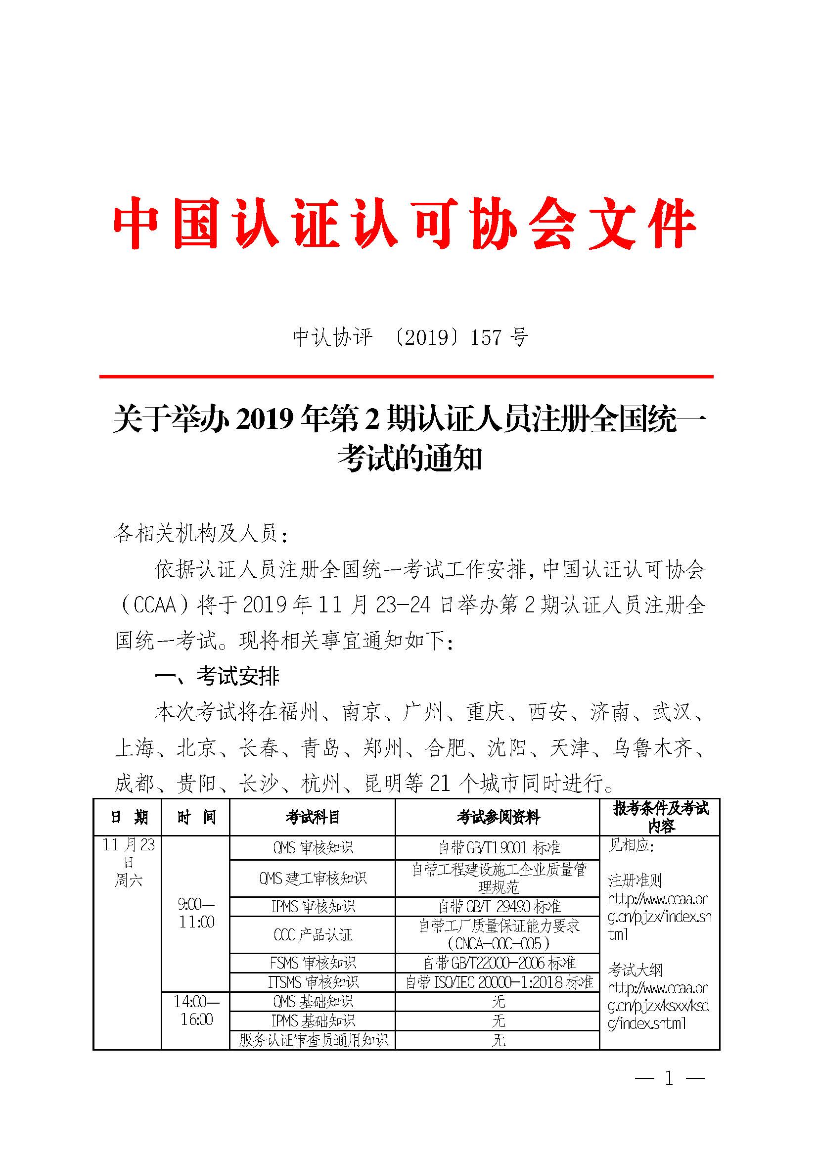 附件 :關(guān)于舉辦 2019 年第2 期認(rèn)證人員注冊(cè)全國(guó)統(tǒng)一考試的通知